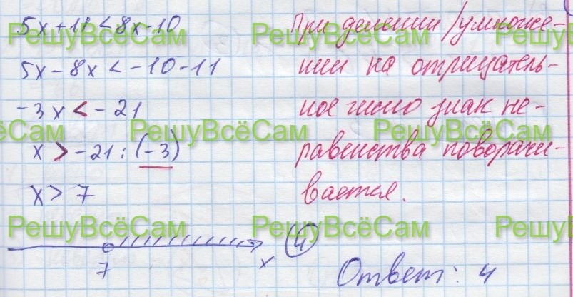 13. Решите неравенство 5x + 11 > 8x – 10 и определите, на каком рисунке изображено множество его решений.