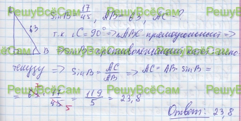 23. В треугольнике АВС угол С равен 90 градусов, sinВ = 17/45, АВ = 63. Найдите АС.