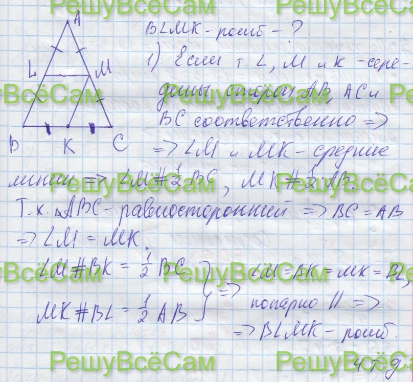 24. В равнобедренном треугольнике ABC точки K, L, M – середины сторон AB, BC, AC соответственно. Докажите, что BLMK – ромб.