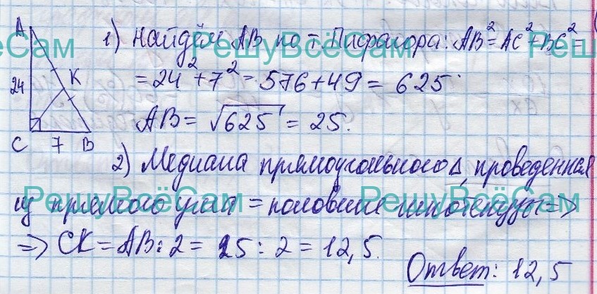 23. В прямоугольном треугольнике ABC с прямым углом C катет AC = 24, BC = 7. Найдите медиану CK.