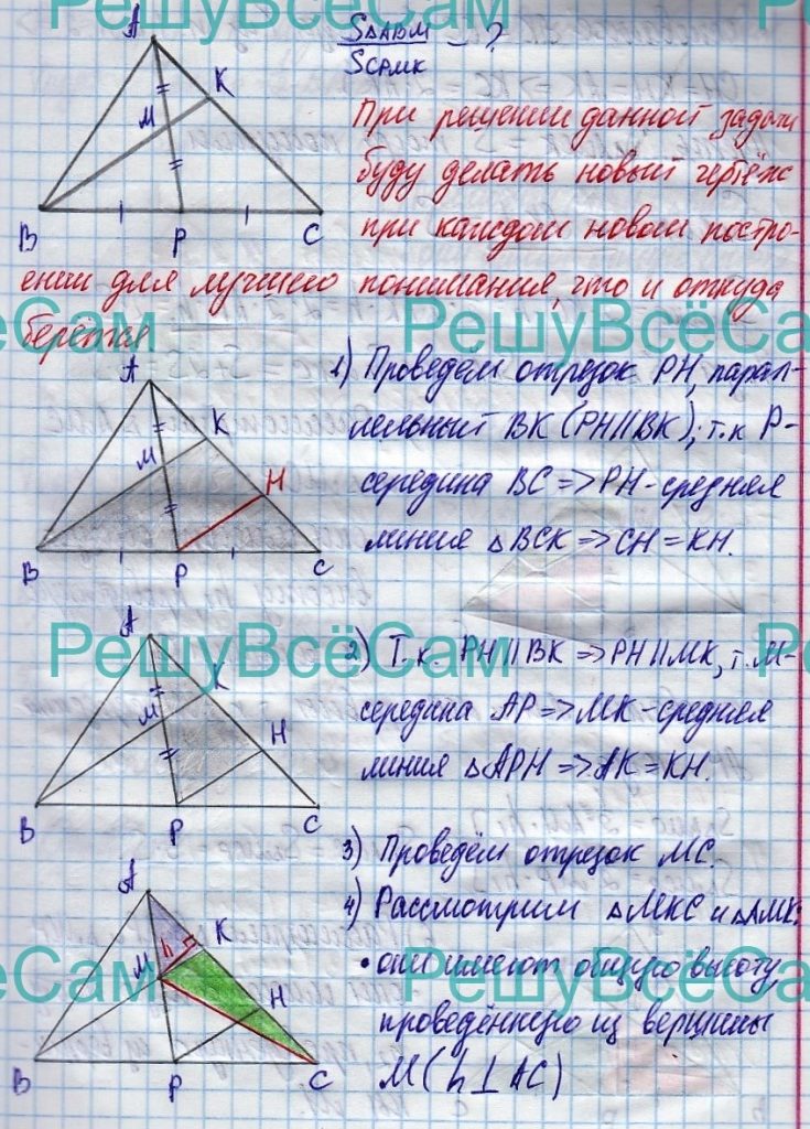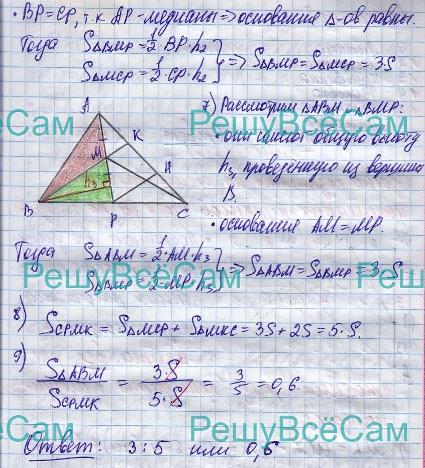 25. Через середину M медианы AP треугольника ABC и вершину B проведена прямая, пересекающая сторону AC в точке K. Найдите отношение площади треугольникаABM к площади четырехугольника CPMK.