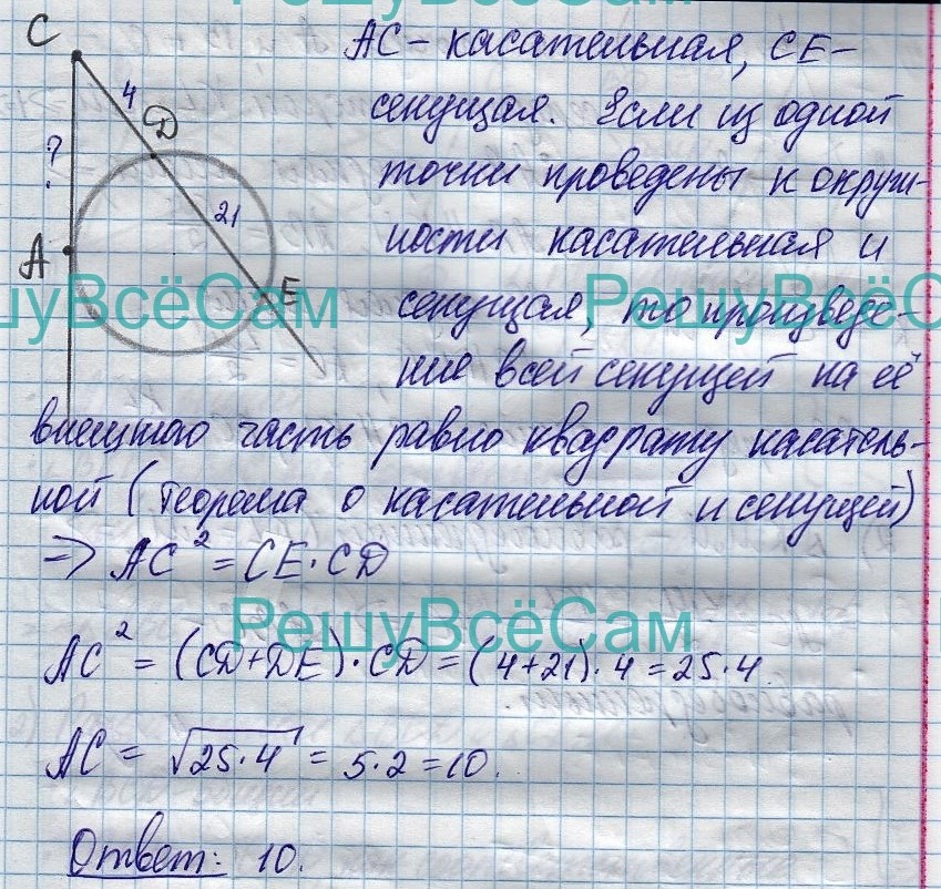23. Через точку С, лежащую вне окружности, проведены две прямые. Одна прямая касается окружности в точке А, а другая прямая пересекает окружность в точках D и E, причем CD = 4, DE = 21. Найдите AC.