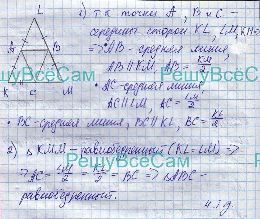 24. В равнобедренном треугольнике KLM (KL = LM) точки A, B, C — середины сторон KL, ML, KM соответственно. Докажите, что треугольник ABC равнобедренный.