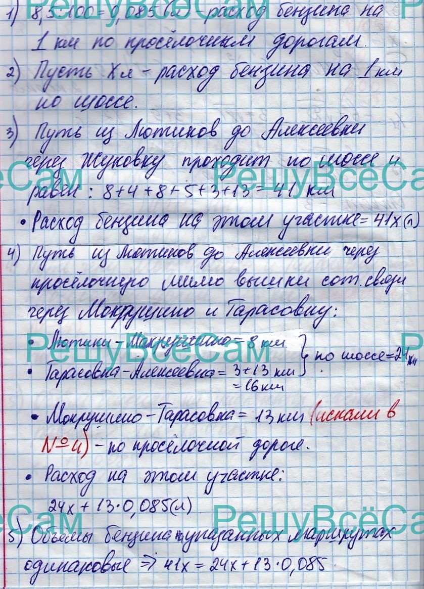 5. На проселочных дорогах машина дедушки расходует 8,5 литра бензина на 100 км. Известно, что на путь из Лютиков до Алексеевки через Жуковку и путь по проселочной дороге мимо вышки сотовой связи через Мокрушино и Тарасовку ей необходим один и тот же объем бензина. Сколько литров бензина на 100 км машина дедушки расходует на шоссе?