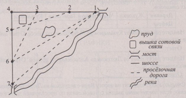 На рисунке 13 изображен план сельской местности. Варя на летних каникулах приезжает в гости к дедушке в деревню Лютики (на плане обозначена цифрой 1). В конце каникул дедушка на машине собирается отвезти Варю на автобусную станцию, которая находится в деревне Алексеевке. Из Лютиков в Алексеевку можно проехать по проселочной дороге мимо реки. Есть другой путь — по шоссе до деревни Жуковки, где нужно повернуть под прямым углом налево на другое шоссе, ведущее в Алесеевку. Третий маршрут проходит по проселочной дороге мимо пруда до деревни Пироговки, где можно свернуть на шоссе до Алексеевки. Четвертый маршрут пролегает по шоссе до деревни Мокрушино, от Мокрушино до Тарасовки по проселочной дороге мимо вышки сотовой связи и от Тарасовки до Алексеевки по шоссе. Еще один маршрут проходит по шоссе до деревни Кузьминки, по проселочной дороге мимо элеватора от Кузьминок до Пироговки и по шоссе до Алексеевки. Шоссе и проселочные дороги образуют прямоугольные треугольники.