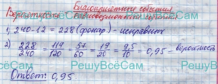 10. В среднем из 240 карманных фонариков, поступивших в продажу, двенадцать неисправных. Найдите вероятность того, что выбранный наудачу в магазине фонарик окажется исправен.
