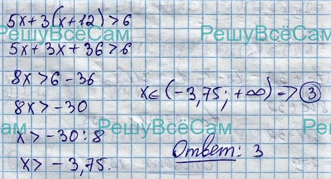 13. Решите неравенство 5x+ 3(x + 12) > 6.