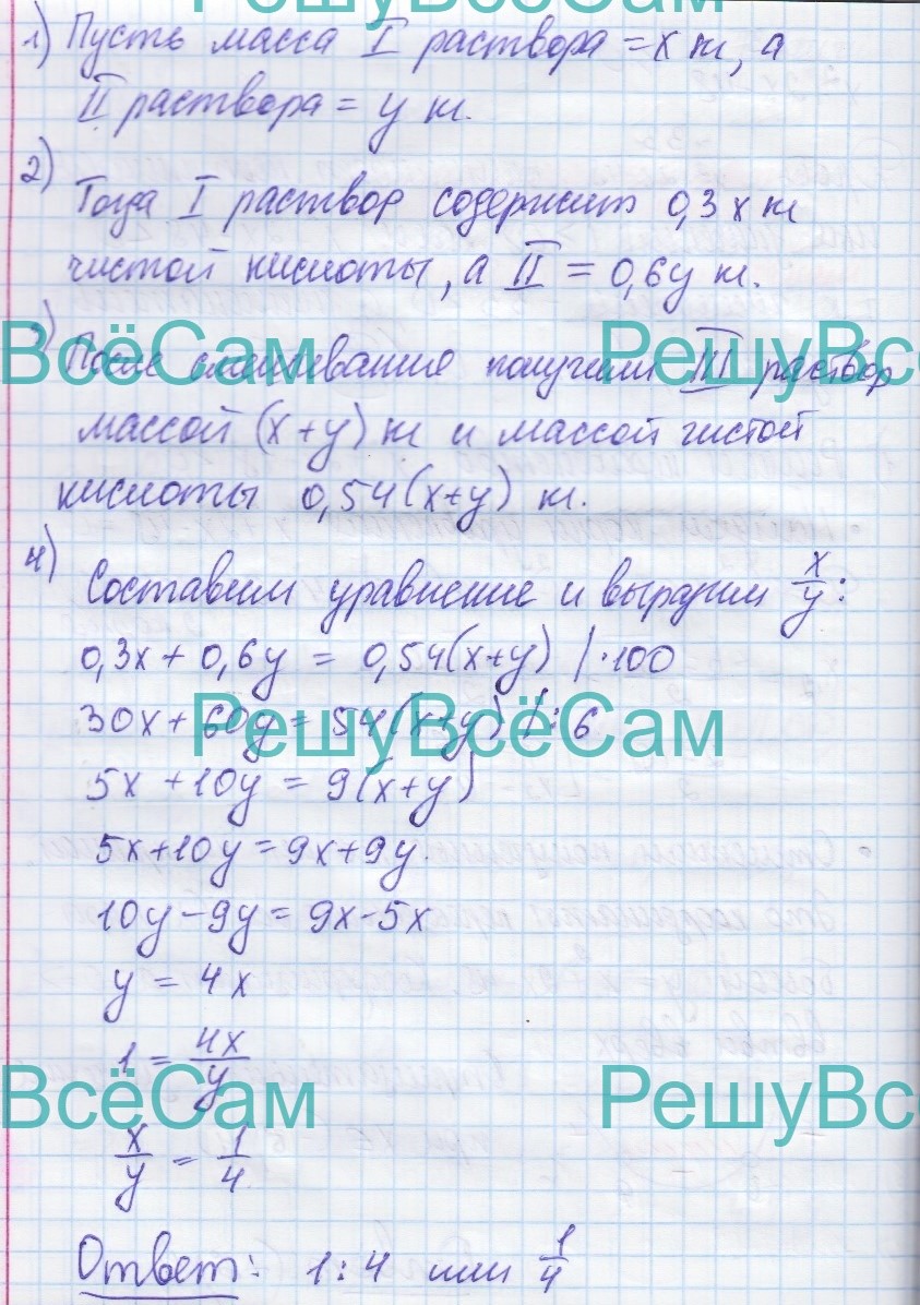21. При смешивании первого раствора кислоты, концентрация которого 30%, и второго раствора этой же кислоты, концентрация которого 60%, получили раствор, содержащий 54% кислоты. В каком соотношении были взяты первый и второй растворы?