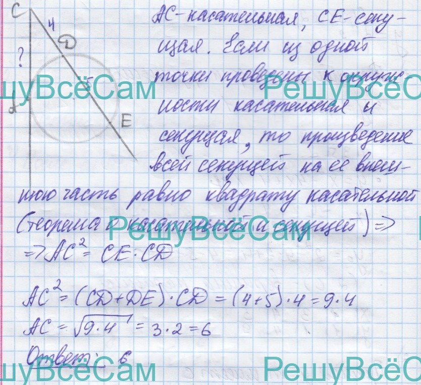 23. Через точку С, лежащую вне окружности, проведены две прямые. Одна прямая касается окружности в точке А, а другая прямая пересекает окружность в точках D и E,причем CD=4, DE= 5. Найдите AC.