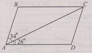 15. Диагональ AC параллелограмма ABCD образует с его сторонами углы, равные 34 градуса и 26 градусов (см.рис.27). Найдите больший угол параллелограмма. Ответ дайте в градусах.