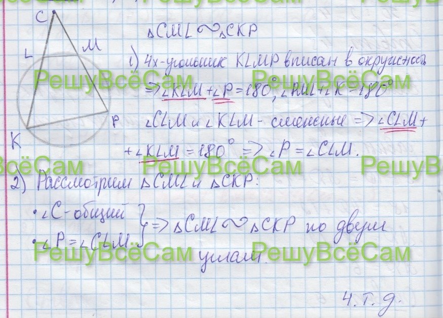 24. Известно, что около четырехугольника KLMP можно описать окружность и что продолжения сторон KL и MP пересекаются в точке C. Докажите, что треугольники CML и CKP подобны.