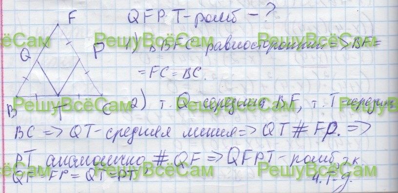 24. В равнобедренном треугольнике BFC точки Q, P, T – середины сторон BF, FC, BC соответственно. Докажите, что QFPT – ромб.