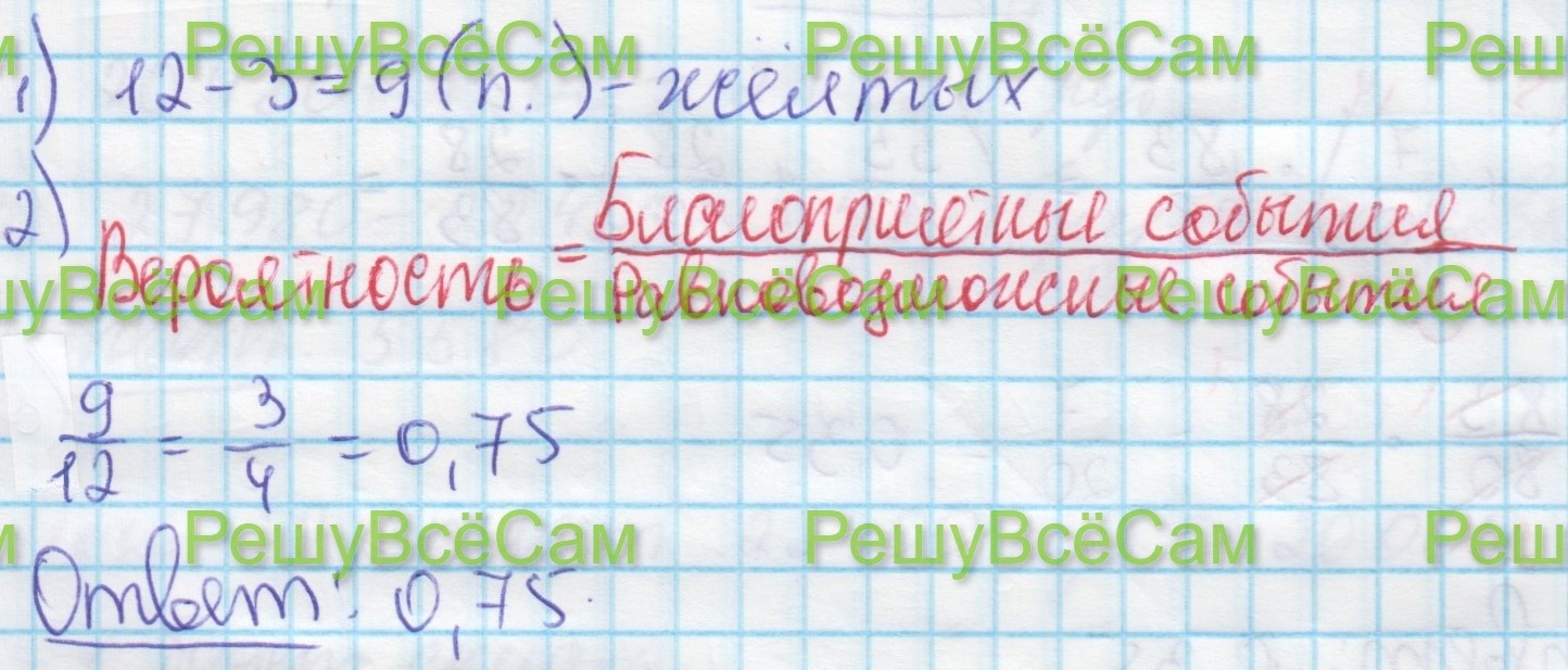 10. У дедушки 12 поплавков: 3 красных, остальные желтые. Дедушка цепляет к удочке случайно выбранный поплавок. Найдите вероятность того, что это будет желтый поплавок.
