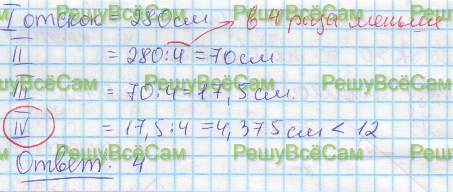 14. У Лизы есть теннисный мячик. Она со всей силы бросила его об асфальт. После первого отскока мячик подлетел на высоту 280 см, а после каждого следующего отскока от асфальта подлетал на высоту в четыре раза меньше предыдущей. После какого по счету отскоку высота, на которую подлетит мячик, станет меньше 12 см?