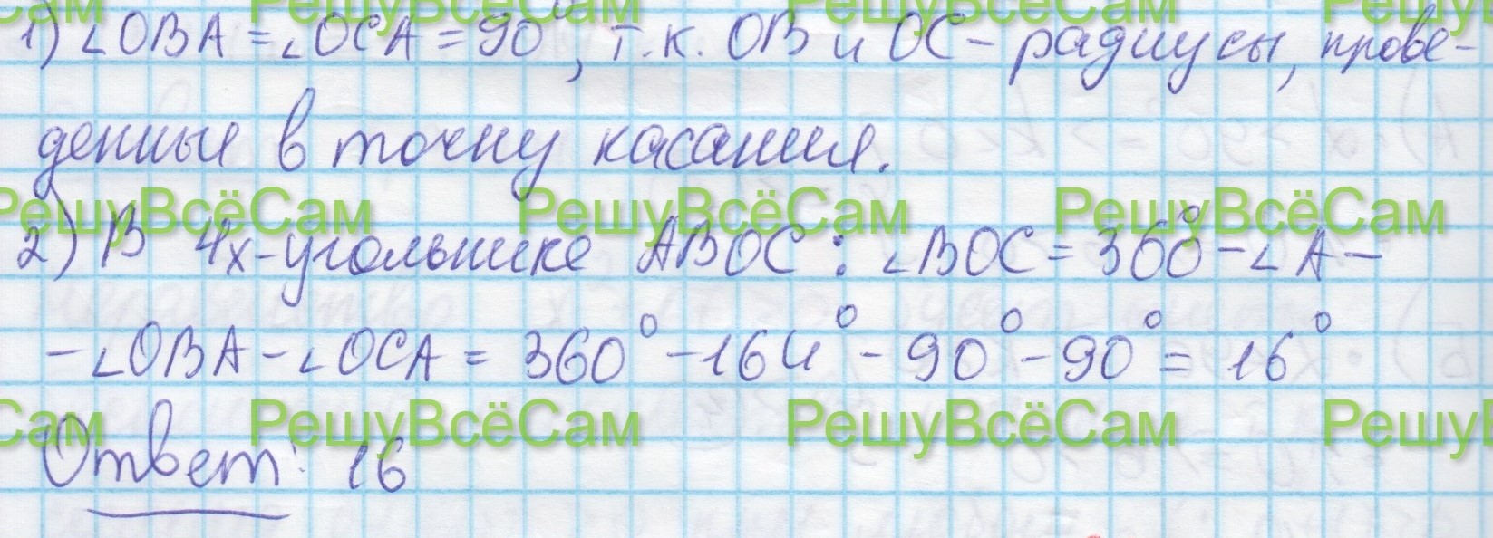 16. В угол А величиной 164 градуса вписана окружность, которая касается сторон угла в точках В и С, точка О – центр окружности (см.рис.72). Найдите угол ВОС. Ответ дайте в градусах.