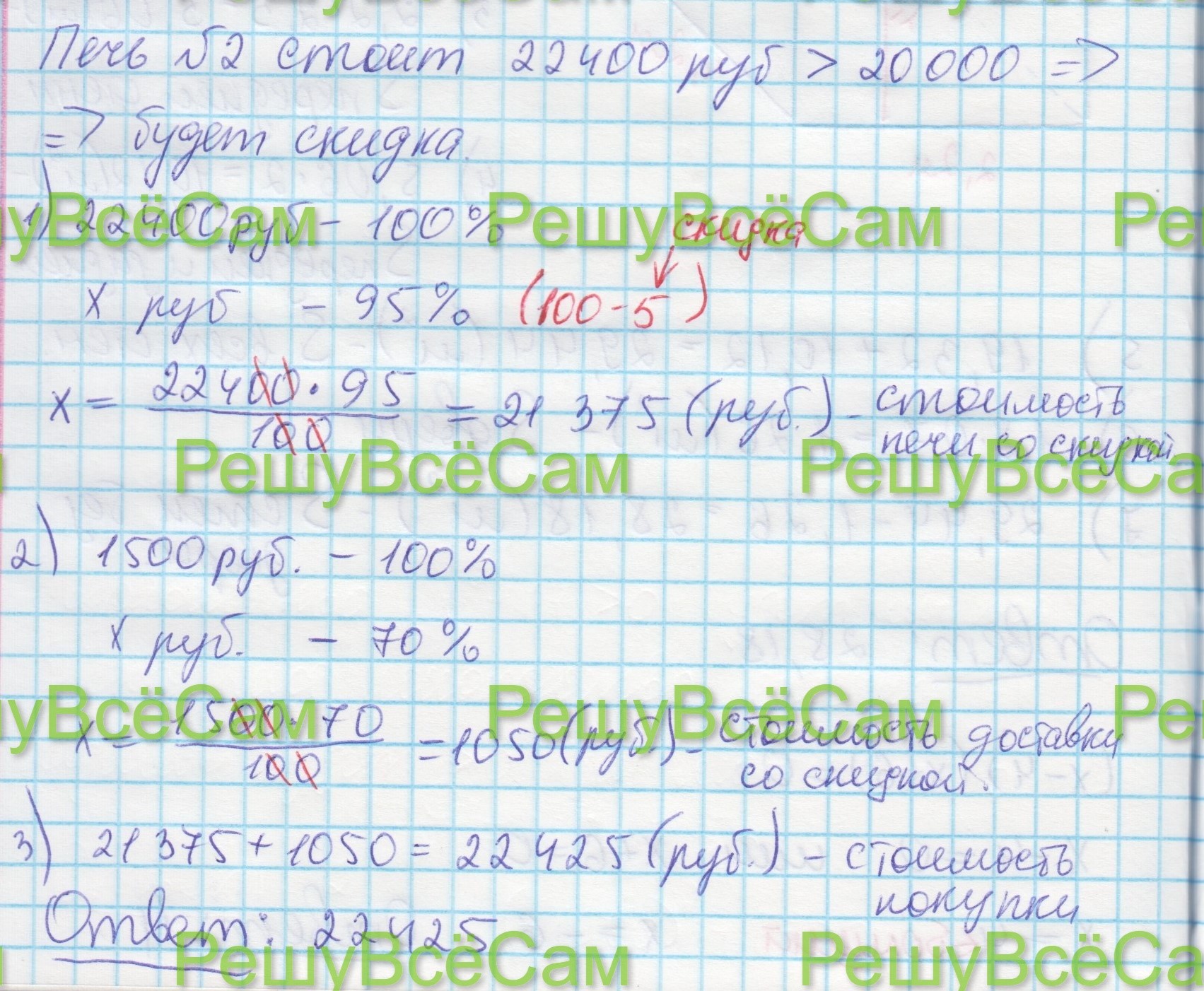 4. Доставка любой печи из магазина до участка стоит 1500 рублей. При покупке печи стоимостью больше 20 000 рублей магазин делает скидку 5% на товар и 30% на доставку. Сколько рублей будет стоить покупка печи номер 2 с доставкой на этих условиях?