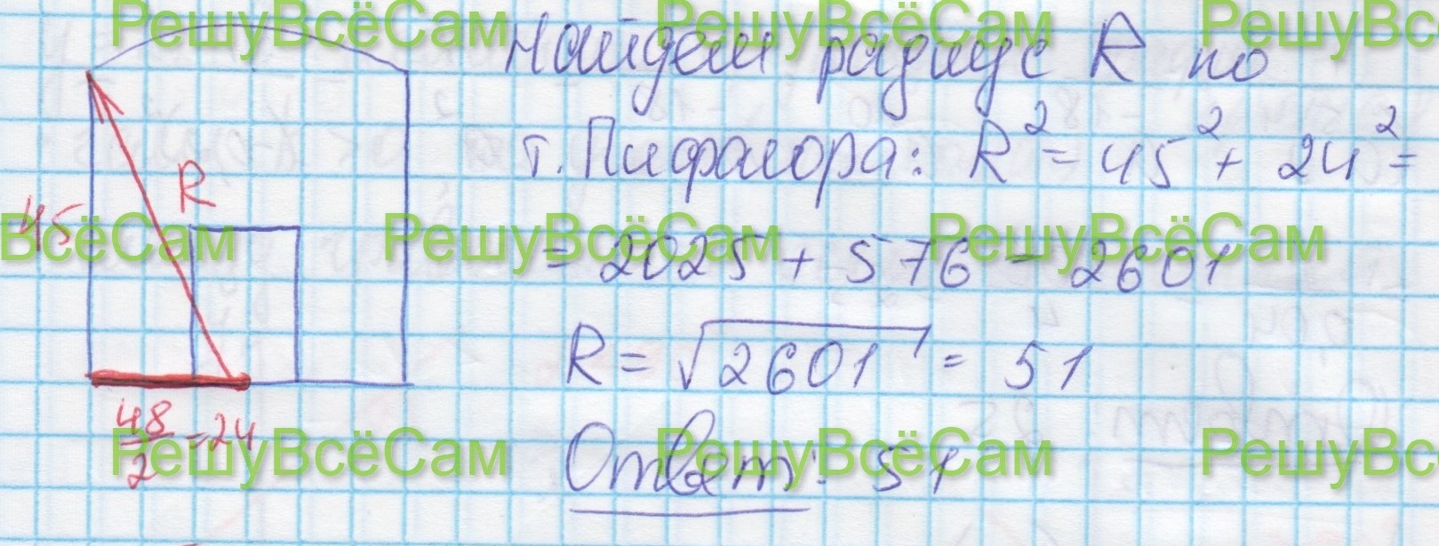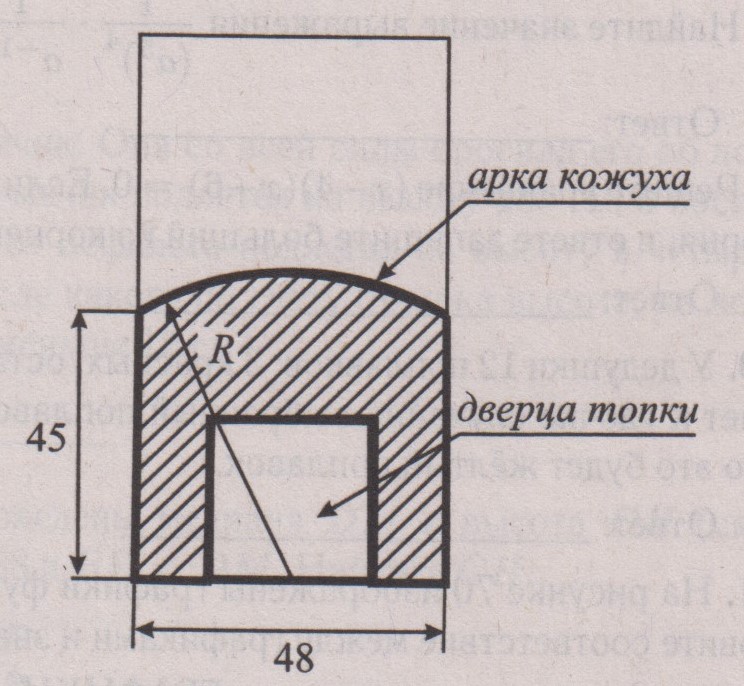 Печи снабжена кожухом вокруг дверцы топки. Верхняя часть кожуха выполнена в виде арки, приваренной к передней стенке печи по дуге окружности с центром в середине нижней части кожуха (см.рис.68). Для установки печи хозяину понадобилось узнать радиус закругления арки R. Размеры кожуха в сантиметрах показаны на рисунке. Найдите радиус закругления арки в сантиметрах.