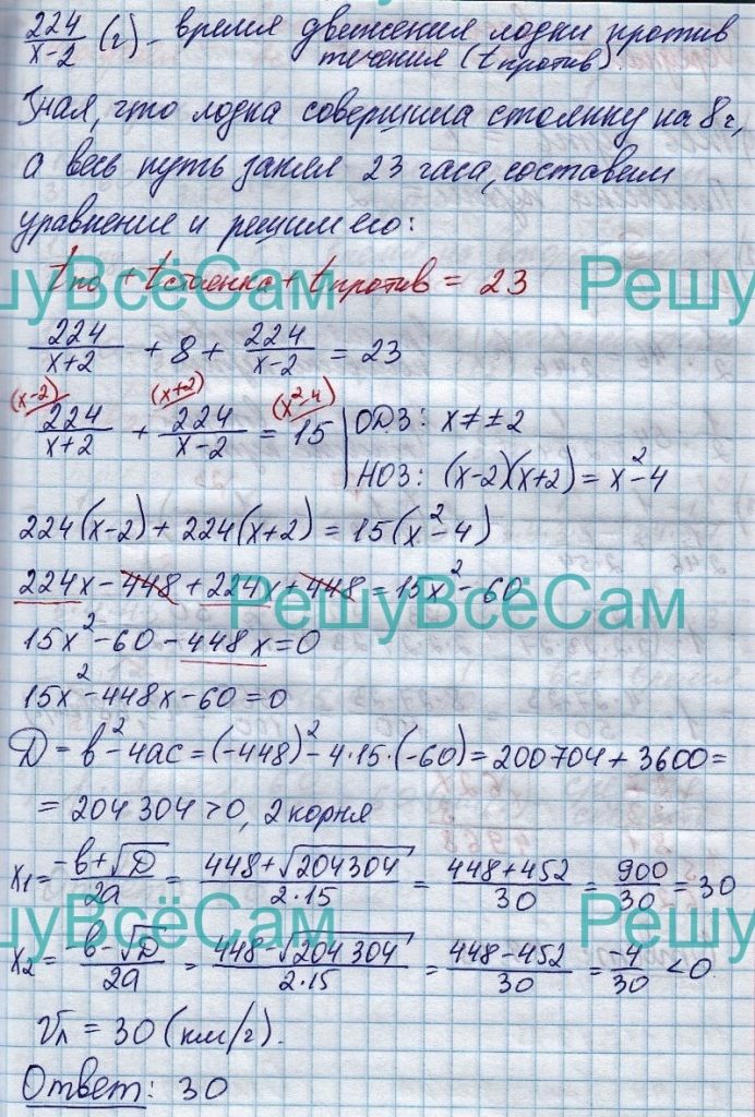 21. Лодка на подводный крыльях проходит по течению реки до пункта назначения 24 км и после стоянки возвращается в пункт отправления. Найдите скорость лодки в неподвижной воде, если скорость течения равна 2 км/ч, стоянка длится 8 часов, а в пункт отправления лодка возвращается через 23 часа после отплытия из него. Ответ дайте в км/ч.