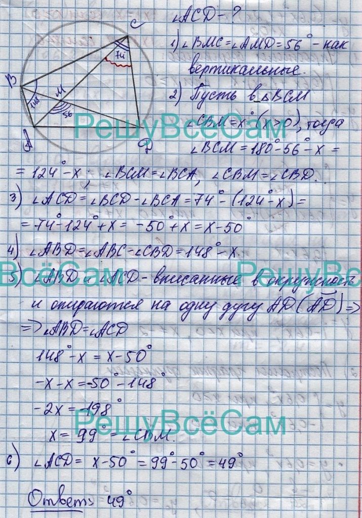 25. Диагонали четырехугольника ABCD, вершины которого расположены на окружности, пересекаются в точке M. Известно, что угол ABC = 148 градуса, угол BCD = 74 градуса, угол AMD = 56 градусов. Найдите угол ACD.