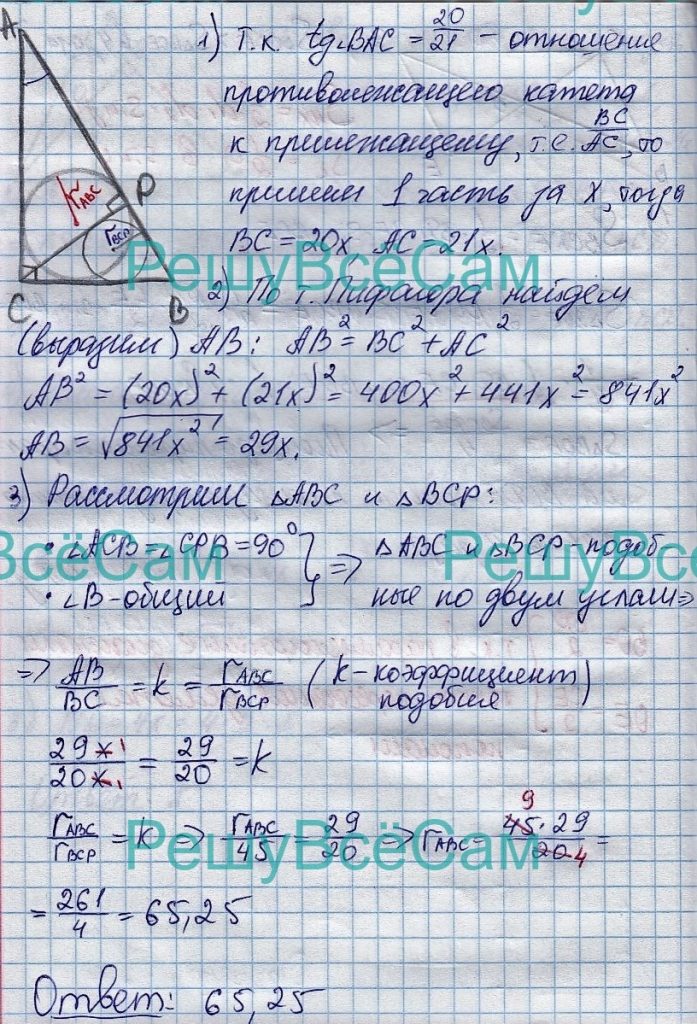 25. Из вершины прямого С треугольника АВС проведена высота СР. Радиус окружности, вписанной в треугольник ВСР, равен 45, тангенс угла ВАС равен 20/21. Найдите радиус окружности, вписанной в треугольник АВС.
