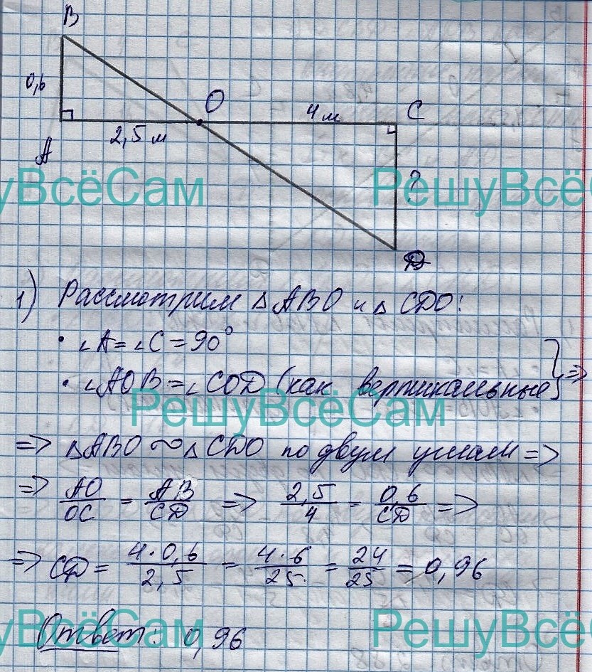 25. Короткое плечо колодца с журавлем имеет длину 2,5 м, а длинное плечо — 4 м. На сколько метров опустится конец длинного плеча, когда конец короткого поднимется на 0,6 м?