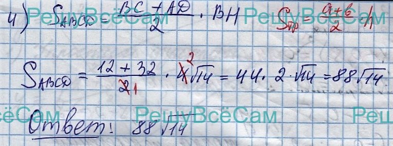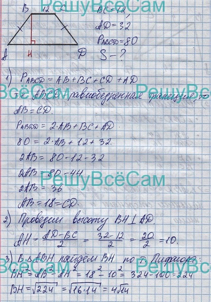 23. Основания равнобедренной трапеции равны 12 и 32, а периметр равен 80. Найдите площадь трапеции.