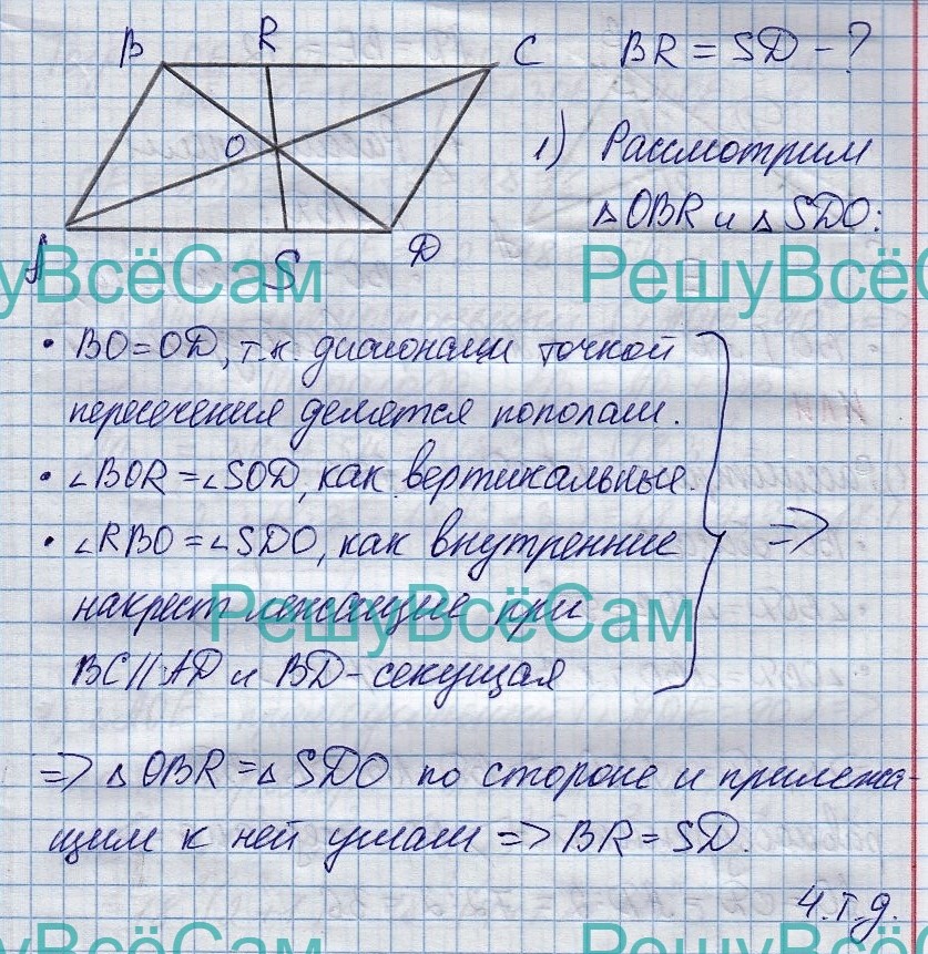 24. Через точку О пересечения диагоналей параллелограмма ABCD проведена прямая, пересекающая стороны BC и AD в точках R и S соответственно. Докажите, что BR = SD.