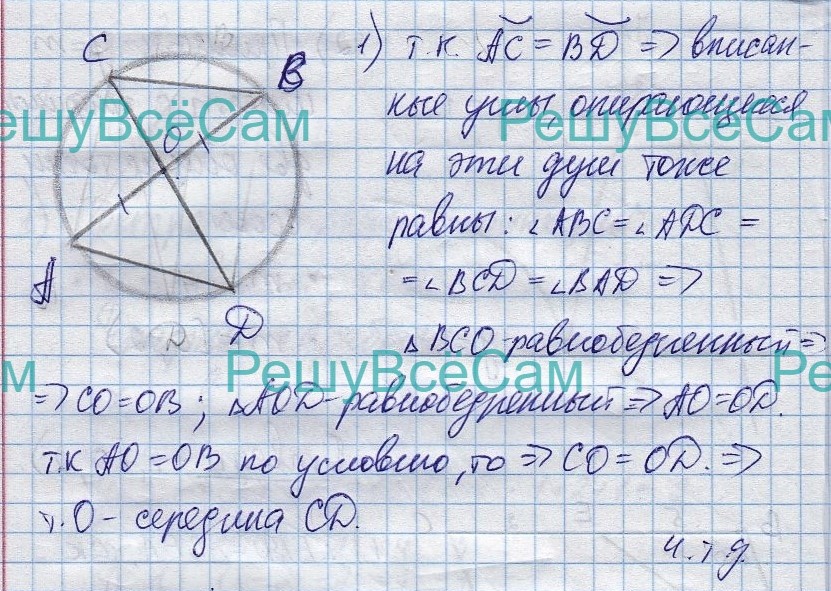 24. В окружности через середину О хорды АВ проведена хорда CD так, что дуги AC и BD равны. Докажите, что О — середина хорды CD.