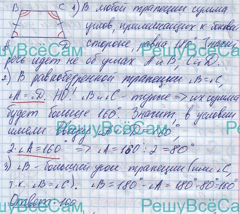 15. Сумма двух углов равнобедренной трапеции равна 160 градусов. Найдите больший угол трапеции. Ответ дайте в градусах.