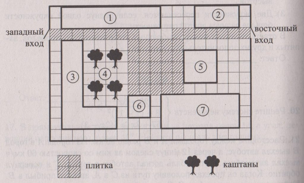 На плане (см.рис.264) изображен парк города Близкого. Парк имеет прямоугольную форму. Сторона каждой клетки равна 2 м. Попасть в парк можно через один из двух входов: западный или восточный.
