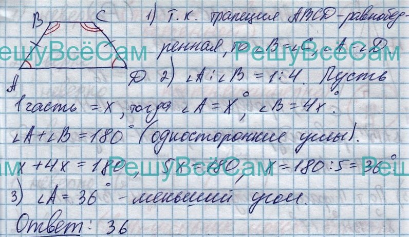 15. Найдите меньший угол равнобедренной трапеции, если два ее угла относятся как 1 : 4. ответ дайте в градусах.