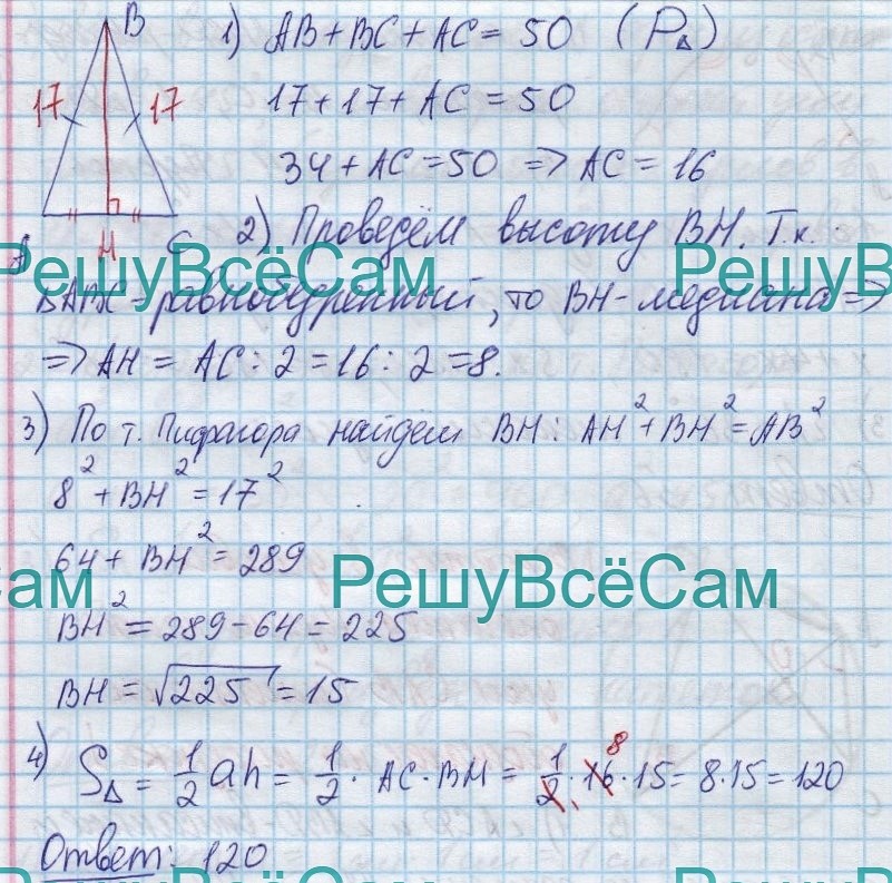 17. Периметр равнобедренного треугольника равен 50, а боковая сторона — 17 (см.рис.274). Найдите площадь треугольника.